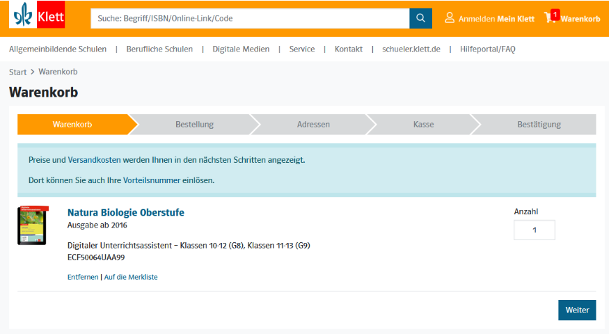 Hinweis: Um Bestellungen auf Schulrechnung zu tätigen, geben Sie im Bestellvorgang unter "Adressen" Ihre verknüpfte Schule als Rechnungsadresse an.