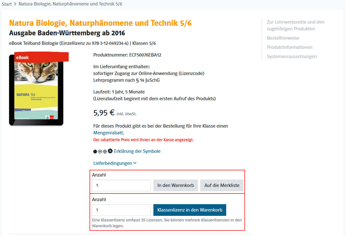 4. Legen Sie sich das ausgewählte eBook in den Warenkorb. Hier können Sie zwischen der Klassenlizenz oder einer individuellen Menge an Lizenzen vom Produkt wählen.