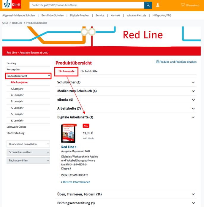 3. In der Produktübersicht können Sie nun auf "Für Lernende" klicken und den Reiter "Digitale Arbeitshefte" aufklappen. Indem Sie auch hier auf "Weitere Informationen" beim passenden Produkt klicken, kommen Sie zur Produktdetailseite.