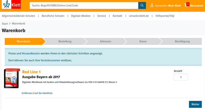 Hinweis: Um Bestellungen auf Schulrechnung zu tätigen, geben Sie im Bestellvorgang unter "Adressen" Ihre verknüpfte Schule als Rechnungsadresse an.