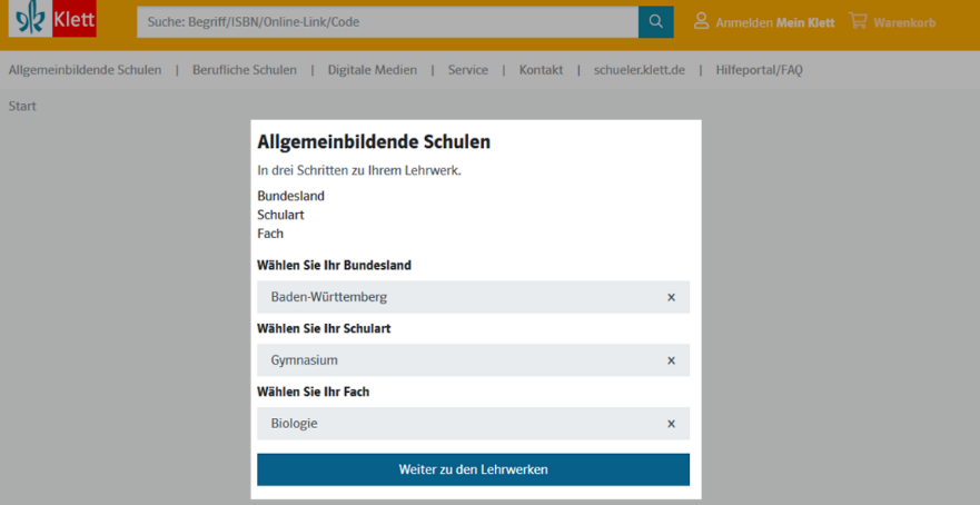 1. Öffnen Sie www.klett.de und rufen Sie Ihr Lehrwerk auf. Klicken Sie hierfür in der Navigation auf Allgemeinbildende Schulen oder Berufliche Schulen und wählen Sie Bundesland, Schulart und Fach aus.