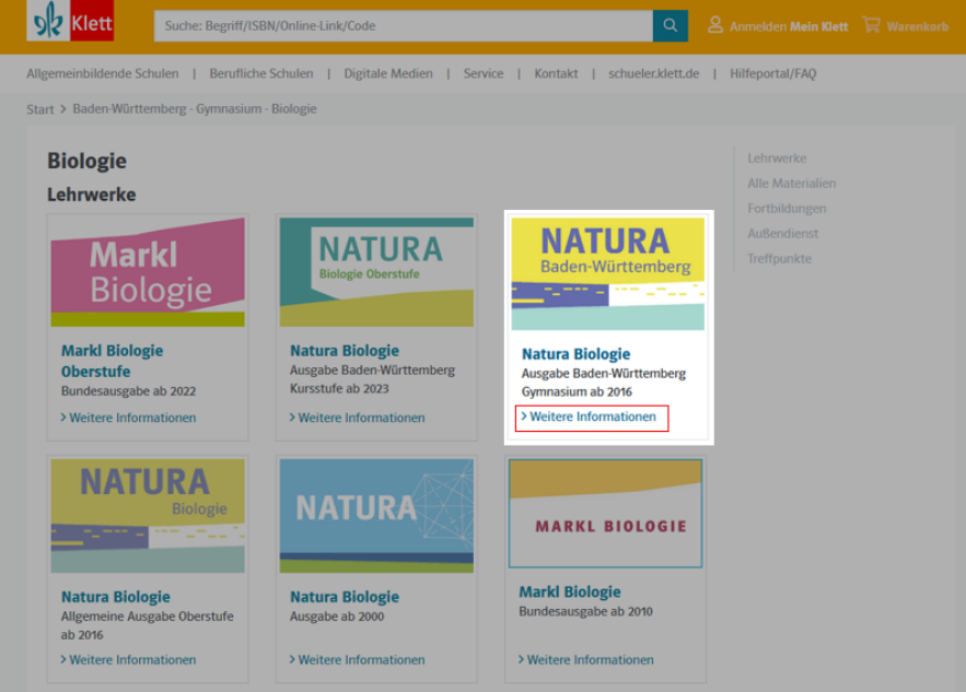 2. Klicken Sie auf "Weitere Informationen", um zu den Produkten zur Lehrwerksreihe zu gelangen. Alle Produkte zu Ihrem Lehrwerk finden Sie anschließend im Reiter Produktübersicht.