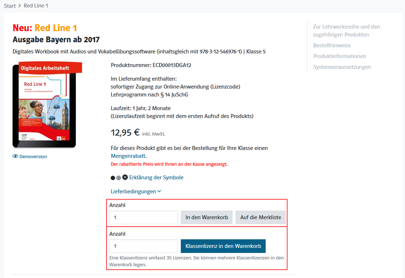 4. Legen Sie sich das ausgewählte digitale Arbeitsheft, in der gewünschten Anzahl, in den Warenkorb. Hier können Sie zwischen der Klassenlizenz oder einer individuellen Menge an Lizenzen vom Produkt wählen.