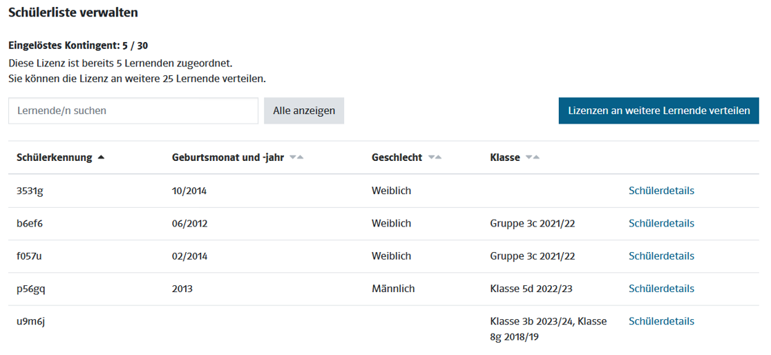 Auf der Startseite können Sie im Bereich des Lernentwicklungsassistenten zur Lizenzübersicht navigieren. Hier finden Sie eine Auflistung aller aktiven oder ehemals genutzten Lizenzen inklusive des Aktivierungsdatums, dem Ende ihrer Laufzeit sowie den zugeordneten Lernenden. Über Klick auf „Lizenzdetails“ in der Tabelle können Sie sich die konkreten Schülerkennungen der Lernenden, die der Lizenz zugeordnet sind, anzeigen lassen.