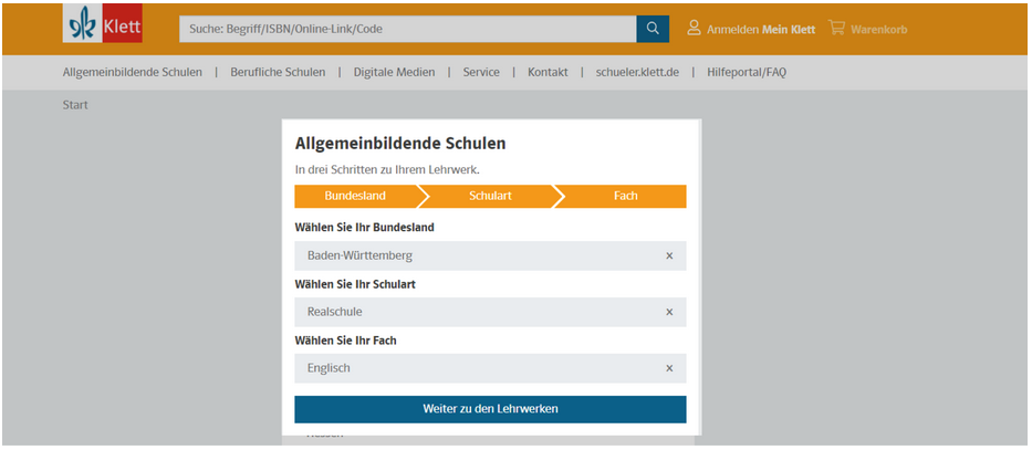 1. Öffnen Sie www.klett.de und rufen Sie Ihr Lehrwerk auf. Klicken Sie hierfür in der Navigation auf Allgemeinbildende Schulen oder Berufliche Schulen und wählen Sie Bundesland, Schulart und Fach aus.