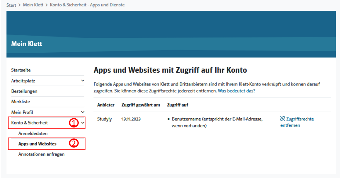 Wenn Sie sich über einen Browser in Ihr Klett Konto einloggen und auf "Konto & Sicherheit", danach auf "Apps und Websites" klicken, gelangen Sie in den Bereich, in welchem Ihnen Anwendungen und Webseiten angezeigt werden, bei denen Sie sich mit ihrem Klett-Konto angemeldet haben und diese daher Zugriff auf Informationen in Ihrem Konto haben.